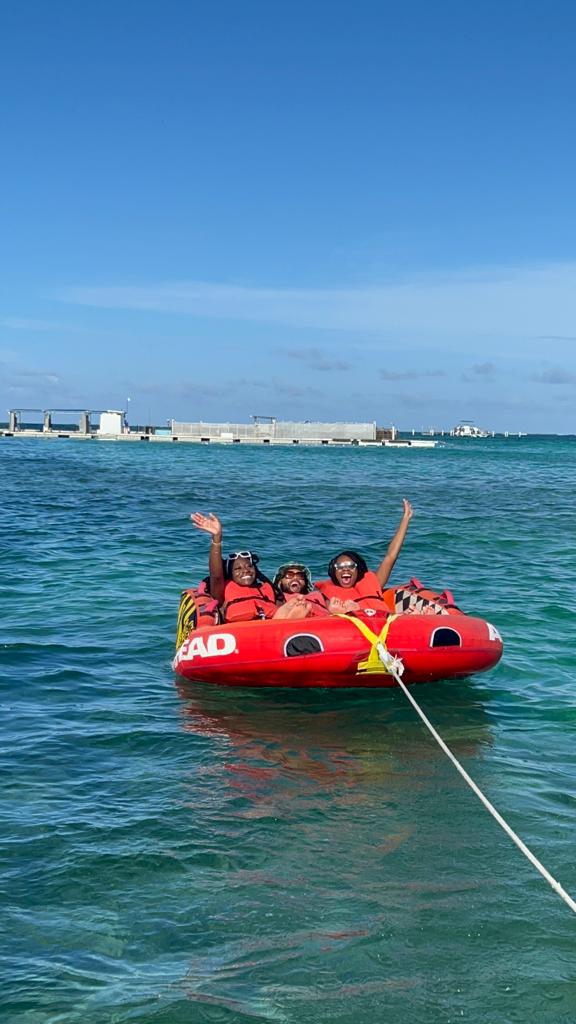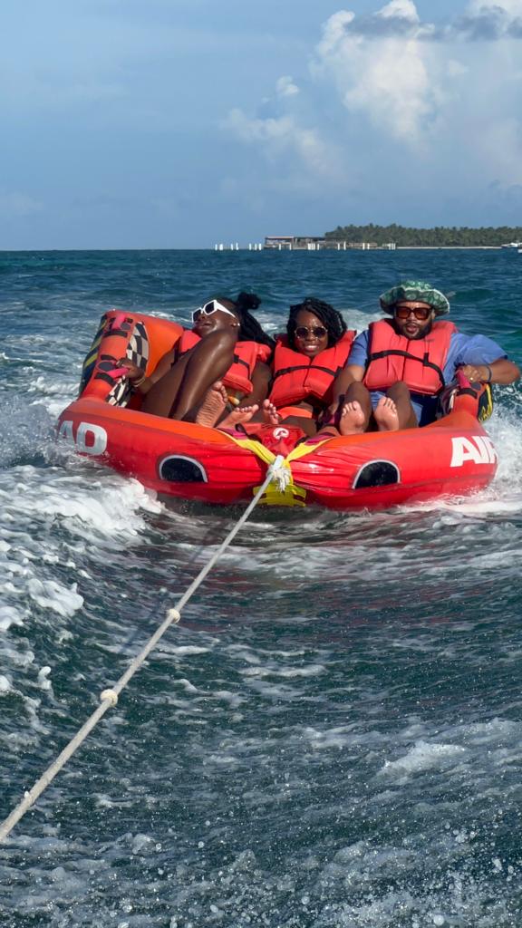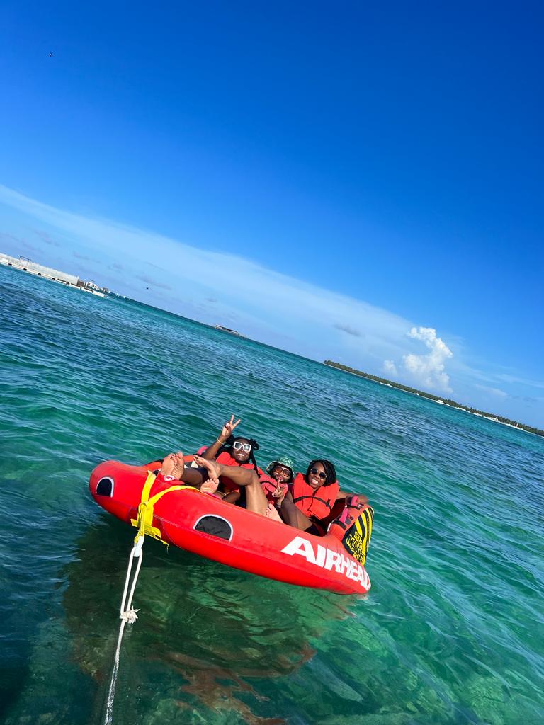 Sube a un inflable tipo sofá arrastrado por una lancha rápida y prepárate para giros, velocidad y muchas risas sobre las aguas cristalinas.